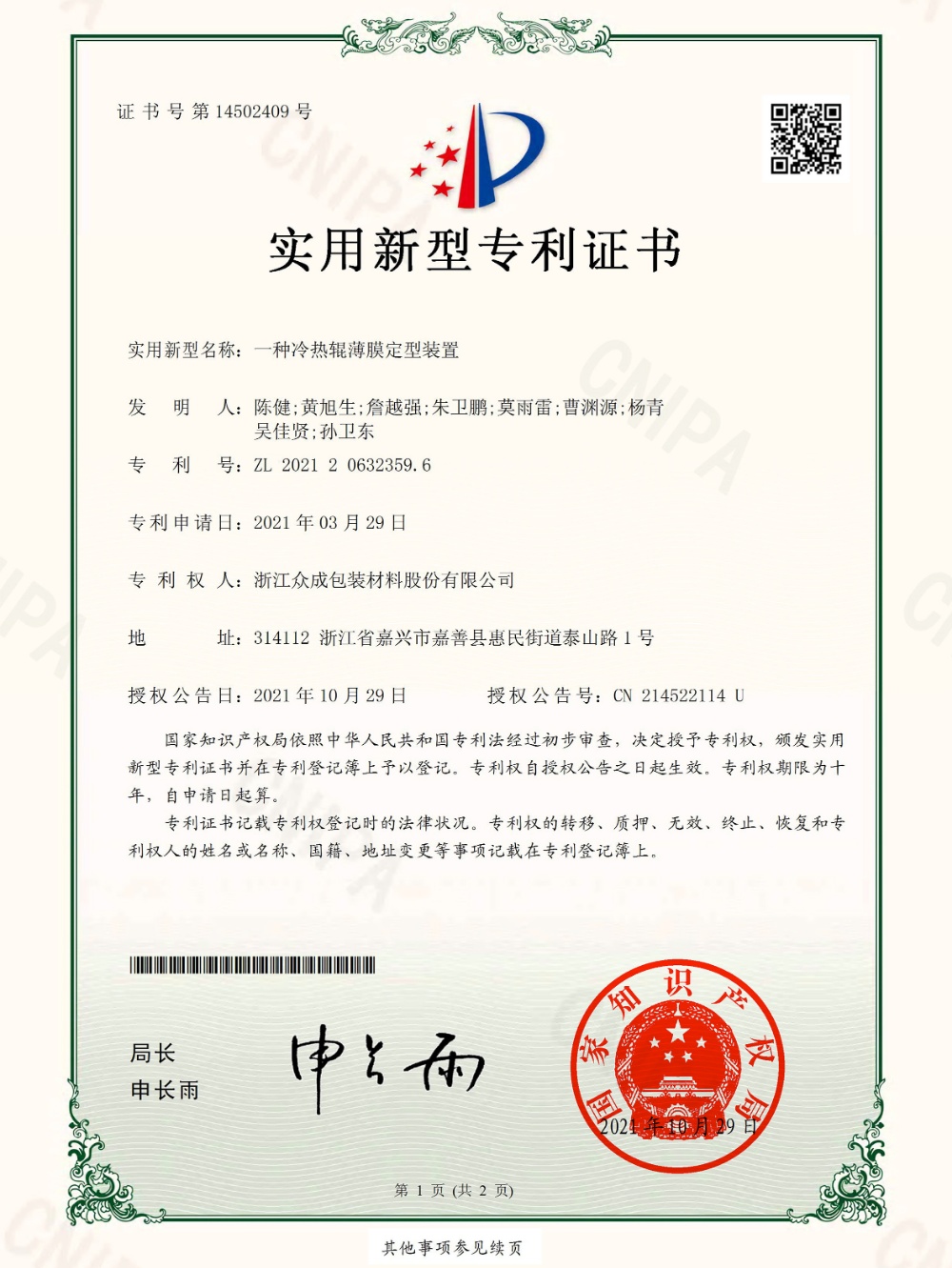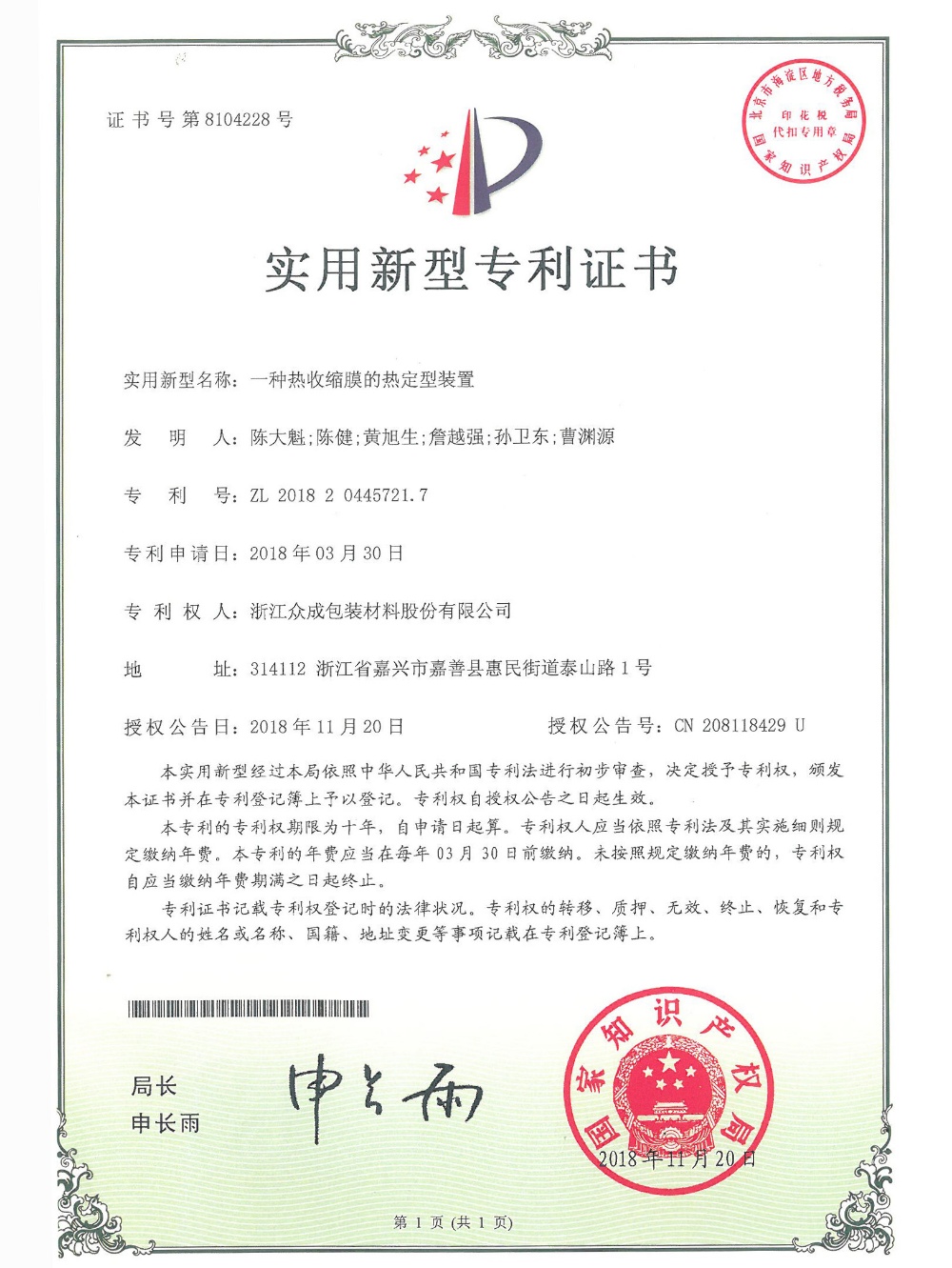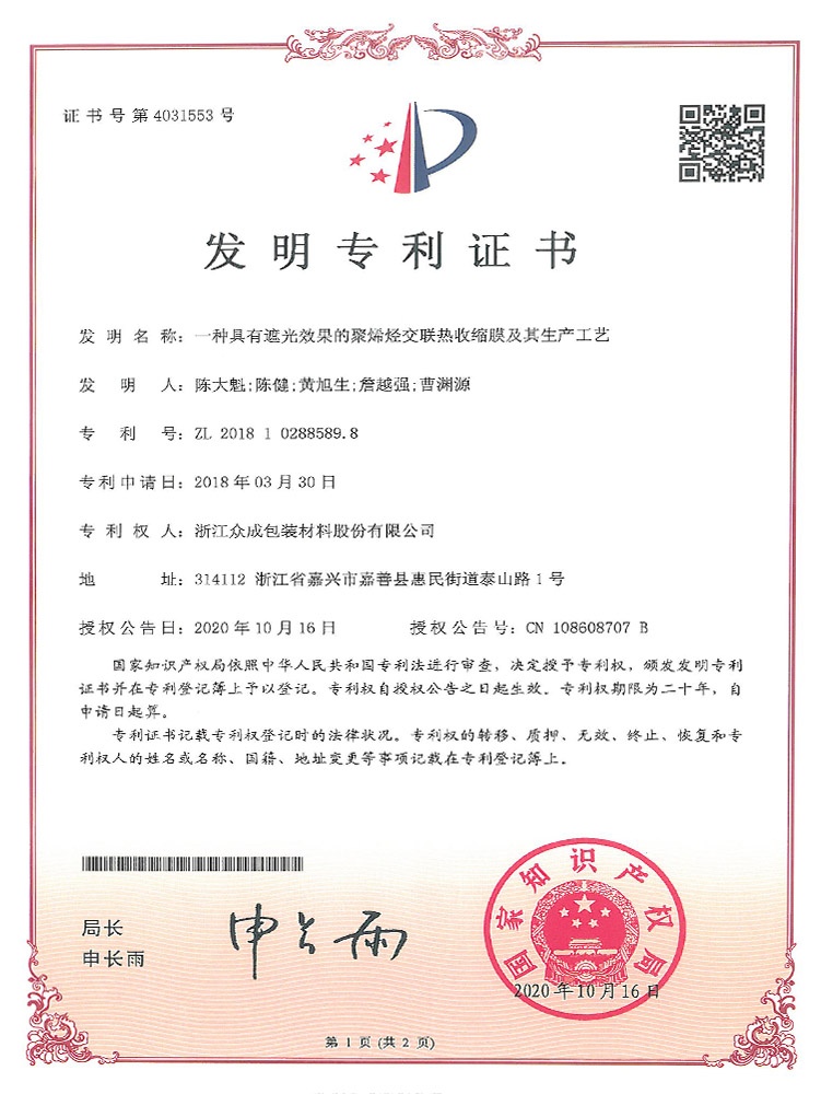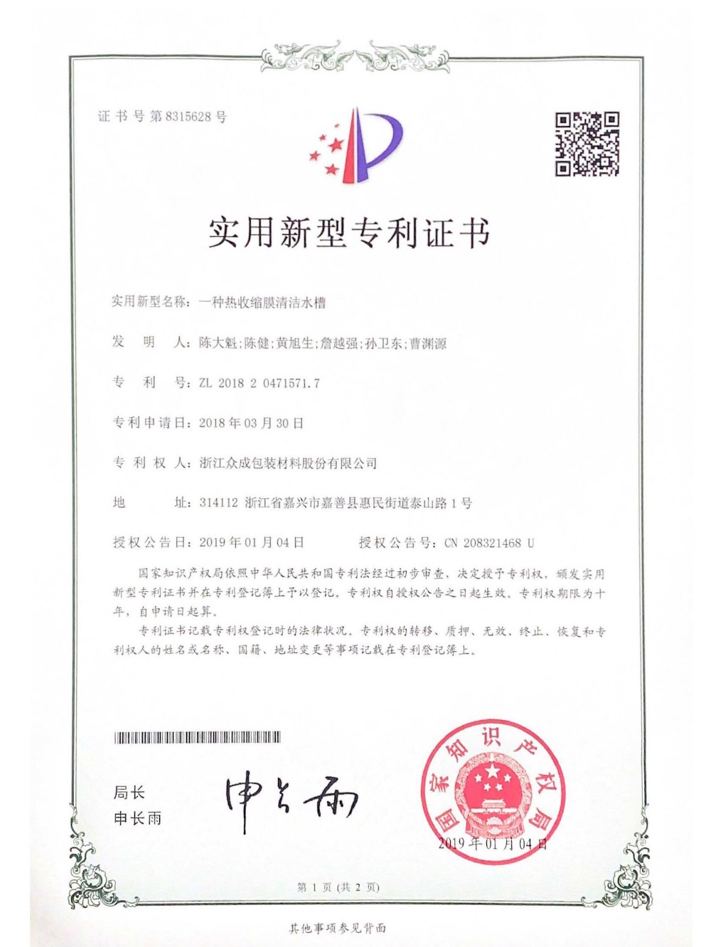 大公司积极践行“赢在更优”的的企业理念抖擞,维持重要设备自做,一直在新类类产品、新生产工艺上确认去创新,已加权平均得到知识储备房屋产权 48 项,但其中发明家专利局 21 项。依次制作了POF平凡热伸缩膜和POF热塑热伸缩膜,并在此条件上进这一步技木创新了聚烯烃高功能(地温)热伸缩透明膜、聚烯烃高伸缩(热塑)透明膜、纸盒封装定制超底伸缩力热伸缩膜、纸盒封装定制聚烯烃超轻薄热伸缩透明膜等房产化新类类产品,几次担负火把年度计划工程项目,得到江西省省完美技木前进奖金奖4次、嘉善市完美技木奖一、金奖各1次,嘉善县完美技木前进奖一级奖2次。